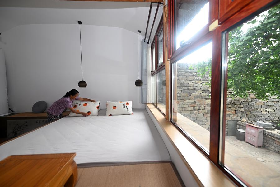 A staff member makes the bed at a homestay in Xijingyu Village of Jizhou District, north China's Tianjin, July 6, 2024. (Xinhua/Zhao Zishuo)