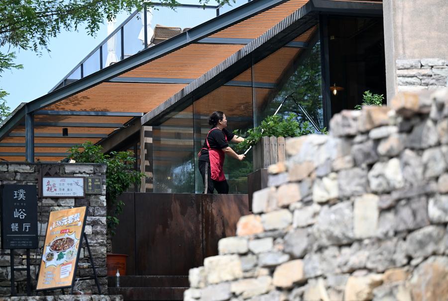 A staff member cleans the glass at a homestay in Xijingyu Village of Jizhou District, north China's Tianjin, July 6, 2024. (Xinhua/Zhao Zishuo)