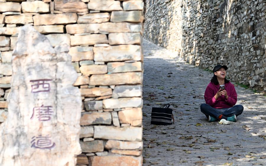 A tourist has fun in Xijingyu Village of Jizhou District, north China's Tianjin, Oct. 12, 2024. (Xinhua/Li Ran)