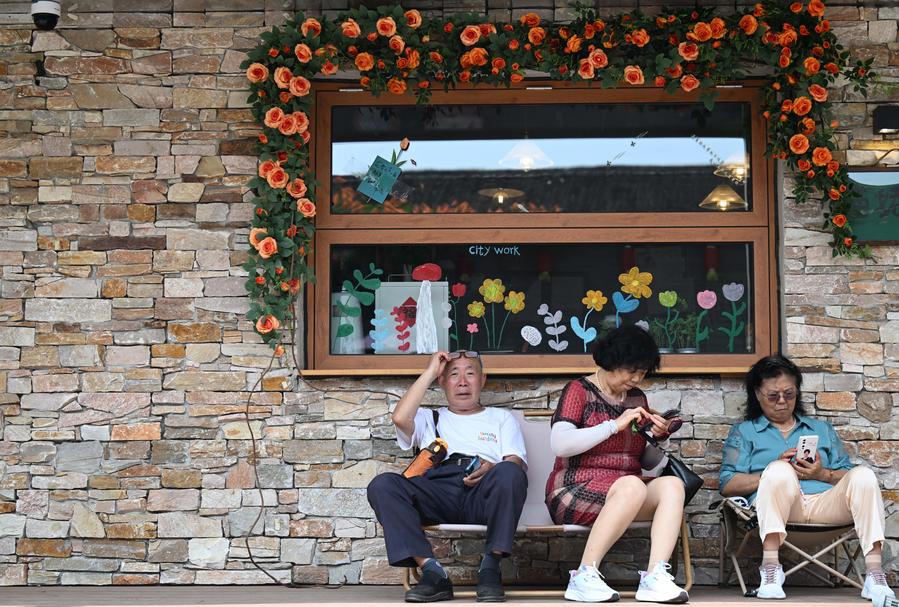 Tourists take a rest at a restaurant in Xijingyu Village of Jizhou District, north China's Tianjin, Oct. 12, 2024. (Xinhua/Li Ran)