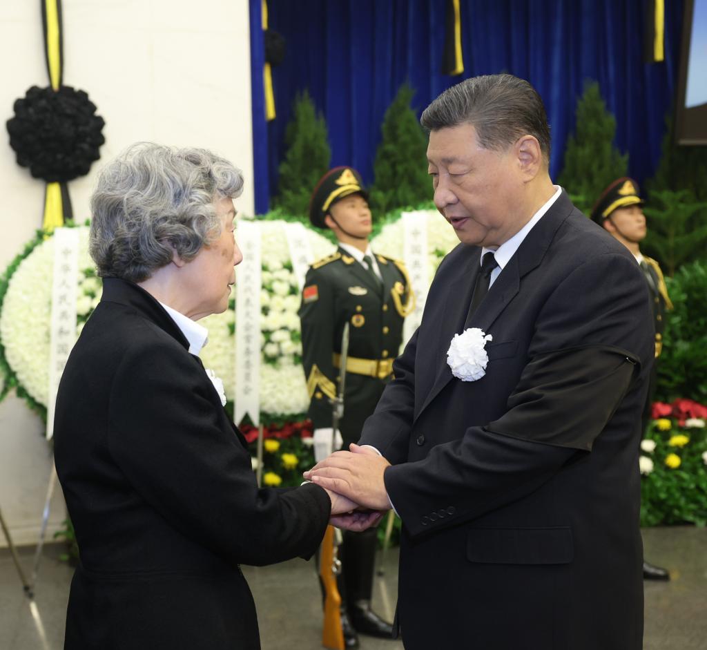 Xi Jinping shakes hands with a family member of Wu Bangguo to express deep condolences in Beijing, capital of China, Oct. 14, 2024. The remains of Wu Bangguo, former chairman of the National People's Congress (NPC) Standing Committee, China's top legislature, were cremated in Beijing on Monday. Chinese leaders including Xi Jinping, Zhao Leji, Wang Huning, Cai Qi, Ding Xuexiang, Li Xi and Han Zheng paid their final respects to Wu at Babaoshan Revolutionary Cemetery. Hu Jintao sent a wreath to express his condolences over Wu's passing. (Xinhua/Ju Peng)