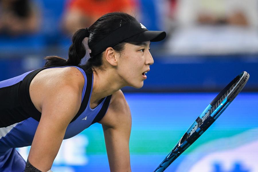 Wang Xinyu in action during the women's singles semifinal against Zheng Qinwen at the 2024 Wuhan Open on Oct. 12, 2024. (Xinhua/Du Zixuan)