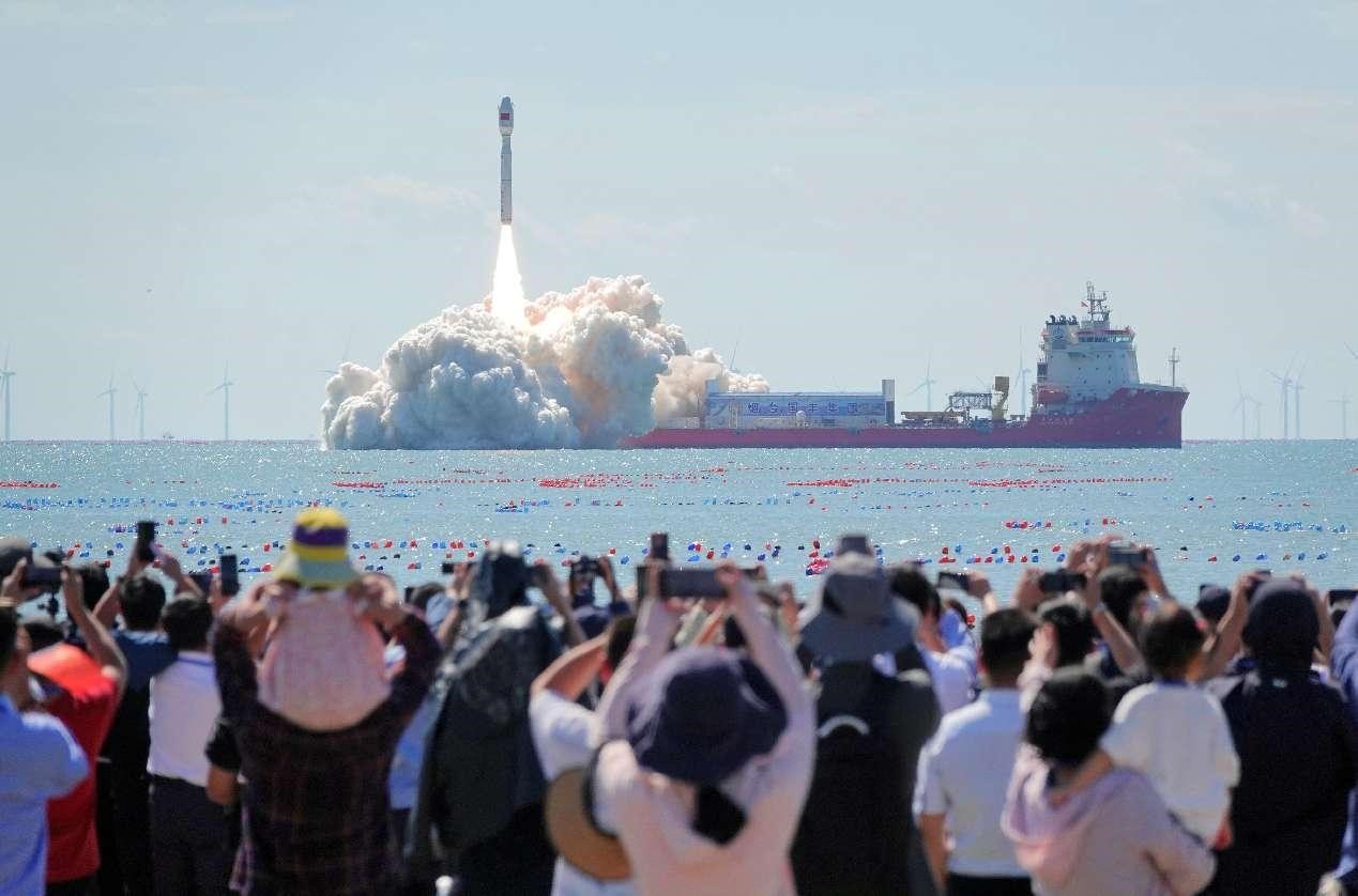 A Smart Dragon-3 carrier rocket carrying eight satellites blasts off from the waters near the city of Haiyang in east China's Shandong province, September 24, 2024. (People's Daily Online/Tang Ke)