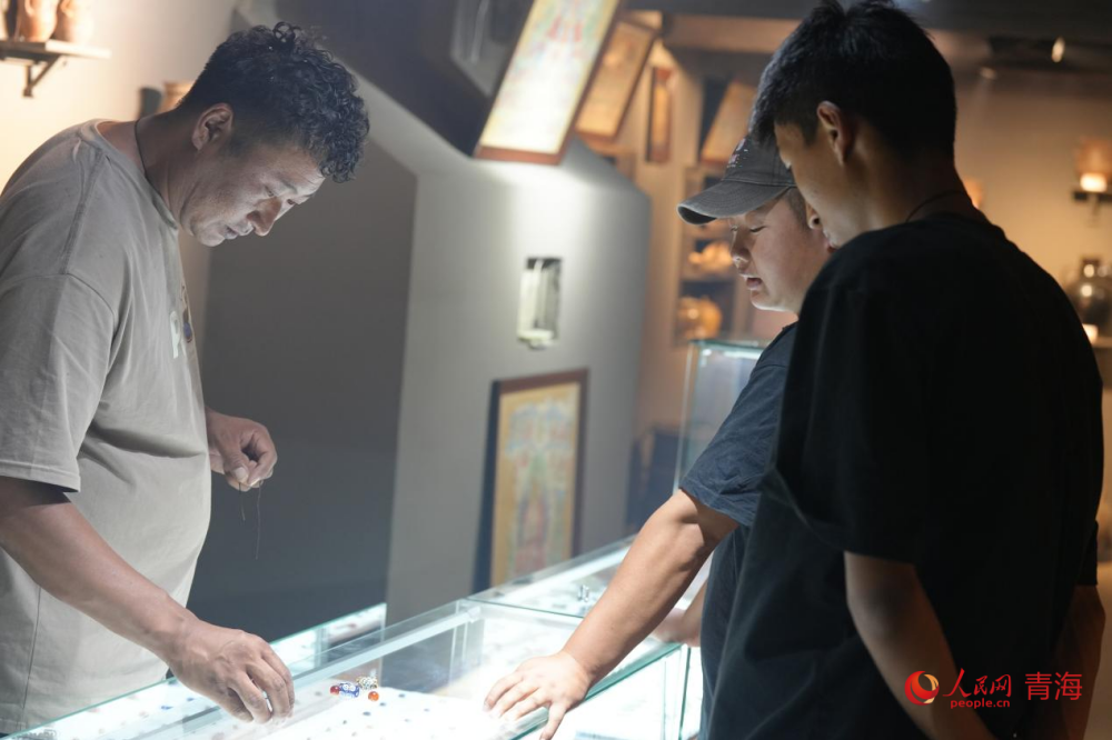 Tourists view cultural and creative products at a shop in Guomari ancient castle in Tongren city, Huangnan Tibetan Autonomous Prefecture, northwest China's Qinghai Province. (People's Daily Online/Chen Mingju)