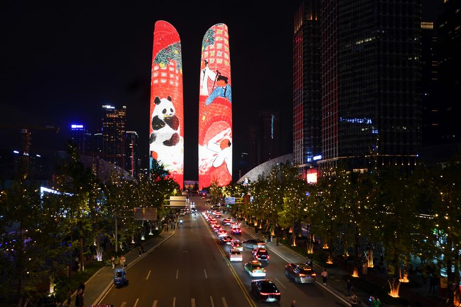 This photo shows a light show in Chengdu, capital of southwest China's Sichuan Province, Oct. 1, 2024. (Xinhua/Xu Bingjie)