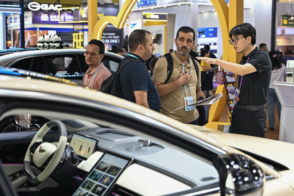 Overseas buyers look at NEVs on show at the 136th session of the China Import and Export Fair in Guangzhou. (Photo/CHINA NEWS SERVICE)