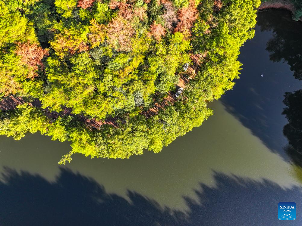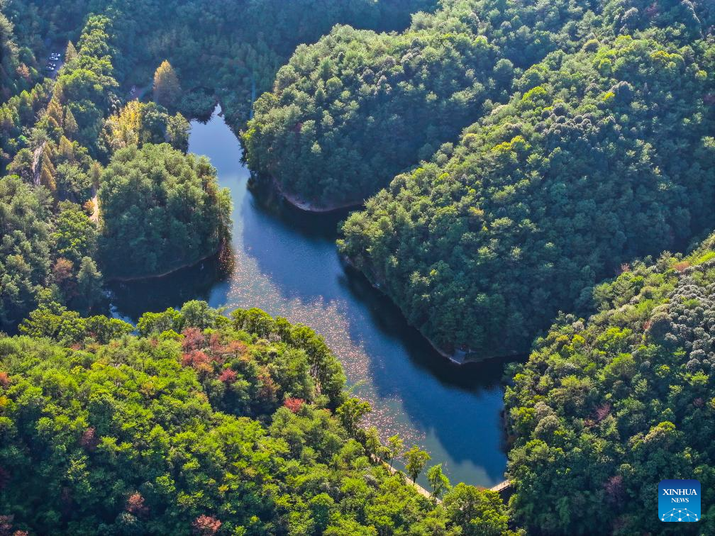 An aerial drone photo taken on Oct. 15, 2024 shows a view of the national nature reserve of Jinyun Mountain in Beibei District, southwest China's Chongqing Municipality.