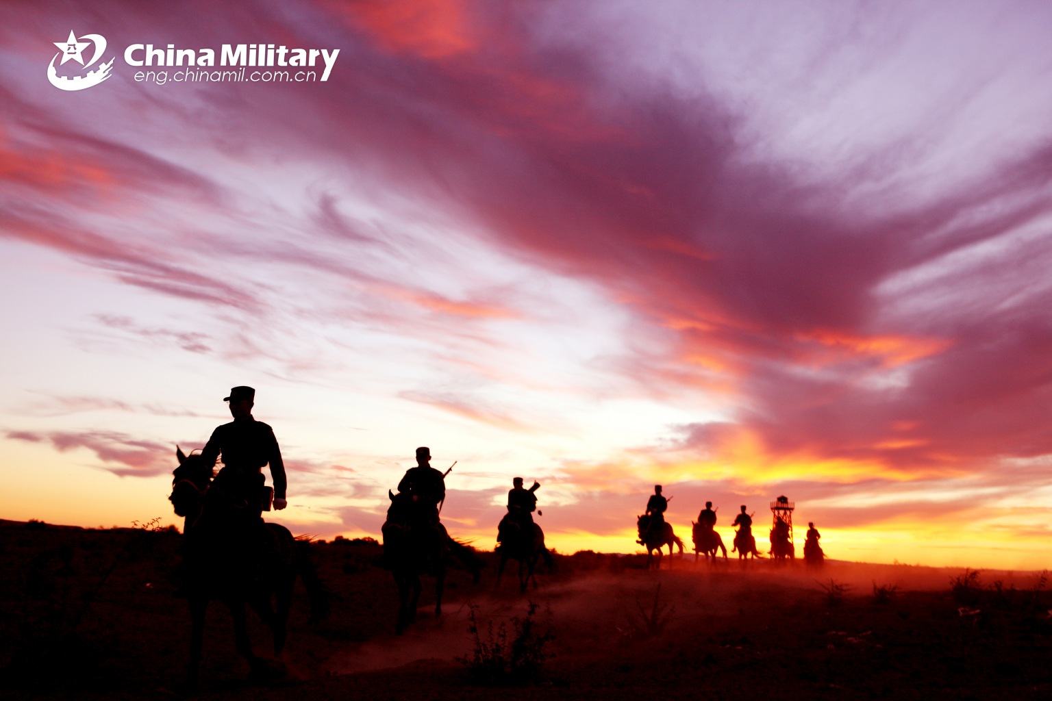 A soldier assigned to a border defense company of the Ili Military Sub-command under the Chinese PLA Xinjiang Military Command stands guard at a lookout post under the sunset on September 29, 2024. (eng.chinamil.com.cn/Photo by Jia Zemin)