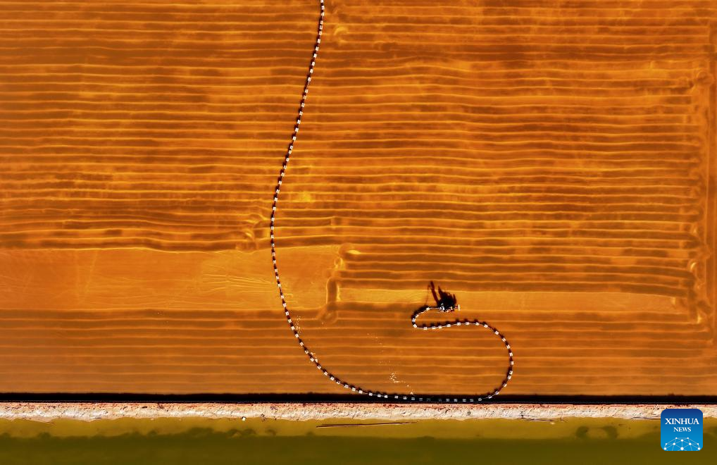 An aerial drone photo taken on Oct. 16, 2024 shows a worker operating a machinery harvesting salt at Nanpu salt field in Caofeidian District of Tangshan, north China's Hebei Province. (Xinhua/Yang Shiyao)