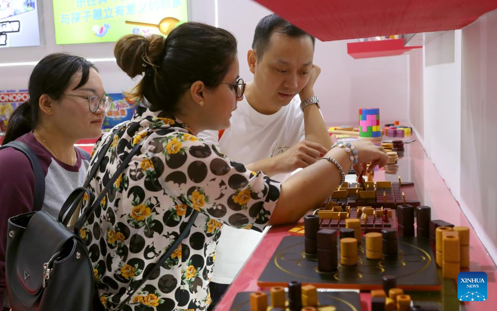 Visitors play an educational board game during the 2024 China Toy Expo in east China's Shanghai, Oct. 16, 2024. The three-day 2024 China Toy Expo kicked off at Shanghai New International Expo Centre Wednesday, attracting more than 2,500 companies of the toy industry from home and abroad. (Xinhua/Fang Zhe)