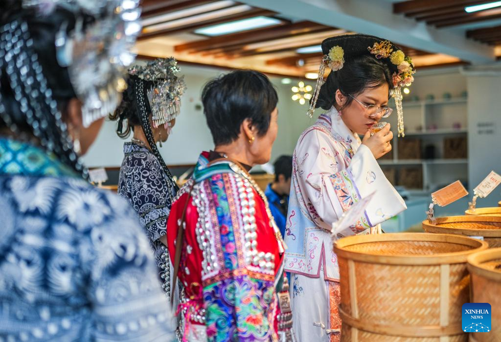 A tourist tastes local snacks at the Qingyan ancient town in Guiyang, capital of southwest China's Guizhou Province, Oct. 16, 2024. (Xinhua/Tao Liang)