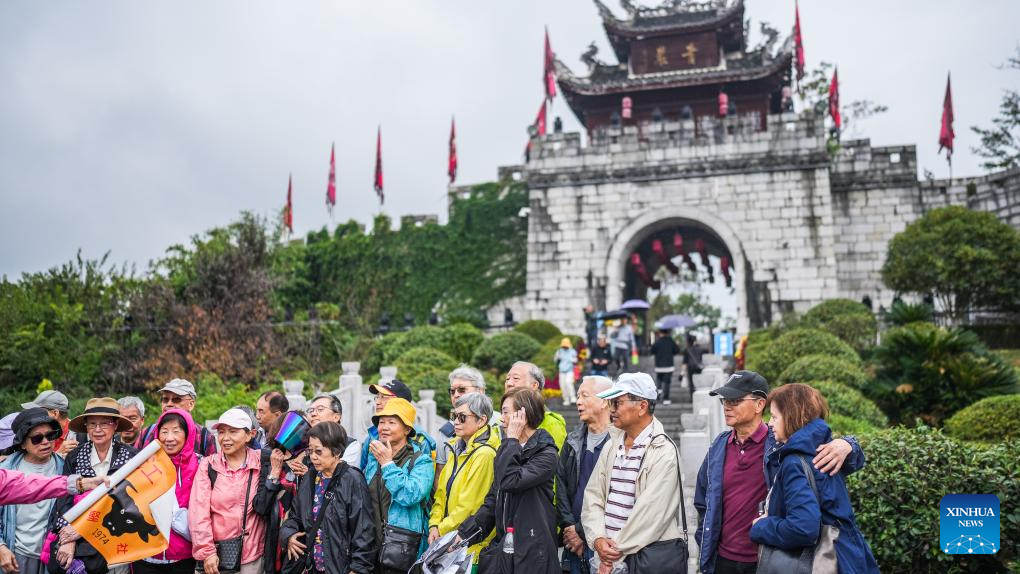 Tourists pose for a group photo at the Qingyan ancient town in Guiyang, capital of southwest China's Guizhou Province, Oct. 16, 2024. (Xinhua/Tao Liang)