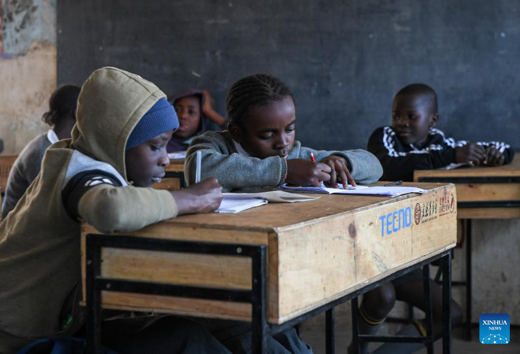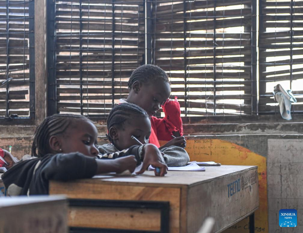 Pupils do their classwork on newly donated desks at a school in Mathare slums in Nairobi, Kenya on Oct. 15, 2024. (Xinhua/Li Yahui)