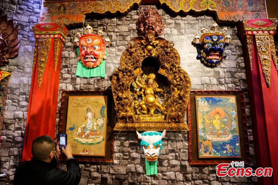 A visitor takes photos of a thangka painting at the Renjun Painting Academy in Tongren, Huangnan Tibetan Autonomous Prefecture, Oct. 16, 2024. (Photo: China News Service/Xue Di)