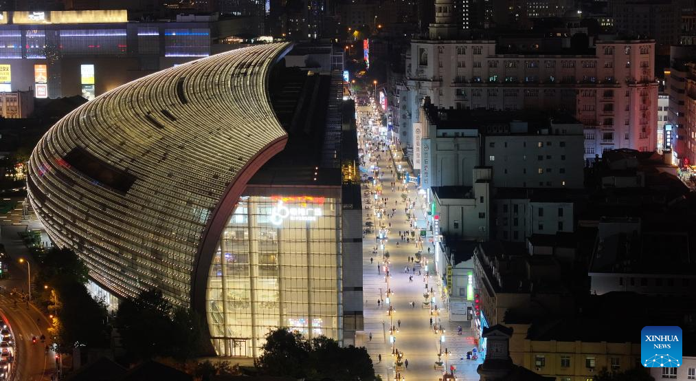An aerial drone photo shows a view of the Golden Street commercial area in north China's Tianjin, Oct. 16, 2024. (Xinhua/Zhao Zishuo)