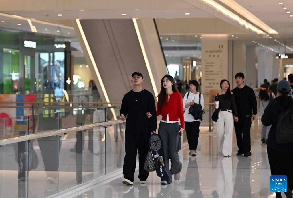 People stroll at a shopping mall in the Golden Street commercial area in north China's Tianjin, Oct. 13, 2024. (Xinhua/Li Ran)