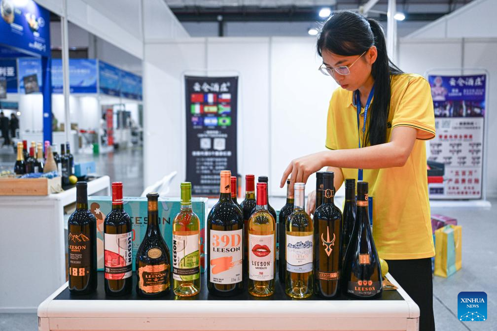 A staff member arranges alcoholic drinks from Chile during the 2nd Hainan International Tropical Food Supply Chain Expo in Haikou, south China's Hainan Province, Oct. 17, 2024. The 2nd Hainan International Tropical Food Supply Chain Expo kicked off here Thursday. (Xinhua/Pu Xiaoxu)