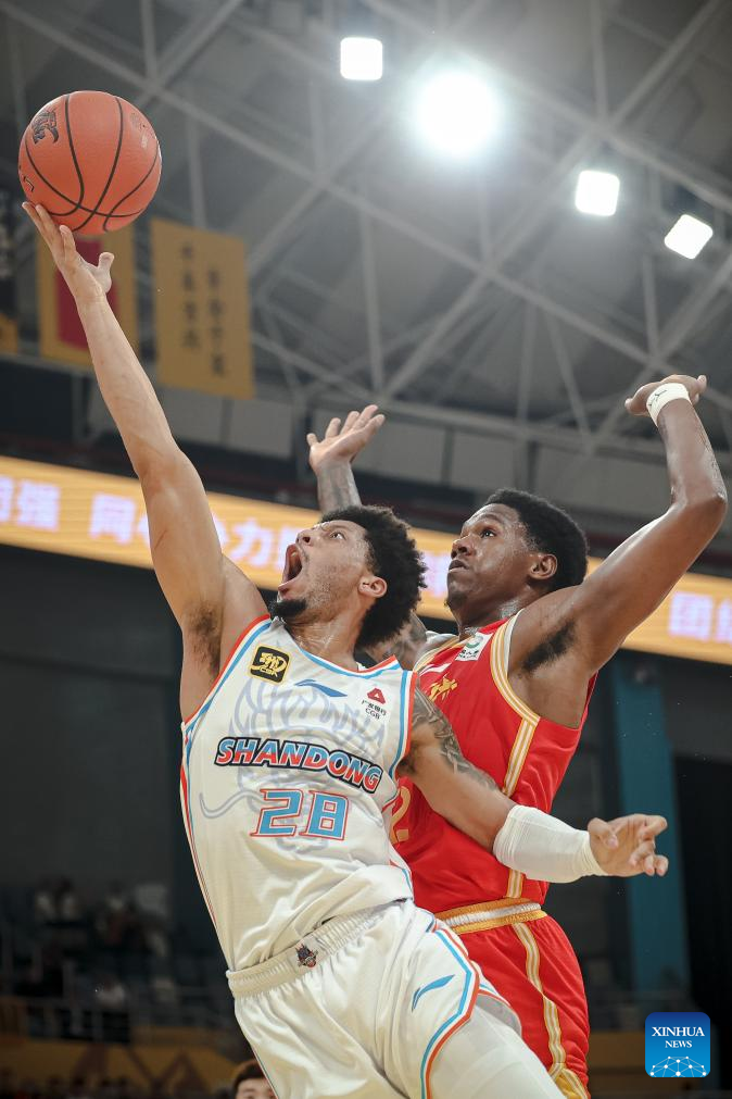 Marquese Chriss (L) of Shandong Heroes goes for a basket during a match between Zhejiang Lions and Shandong Heroes at the 2024-2025 season of the Chinese Basketball Association (CBA) league in Hangzhou, east China's Zhejiang Province, Oct. 17, 2024. (Xinhua/Jiang Han)