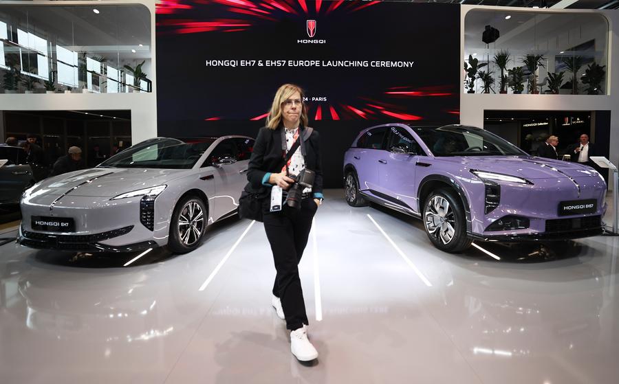 A woman visits the pavilion of Chinese carmaker FAW-Hongqi at the 2024 Paris Motor Show during the media day in Paris, France, Oct. 14, 2024. (Xinhua/Gao Jing)