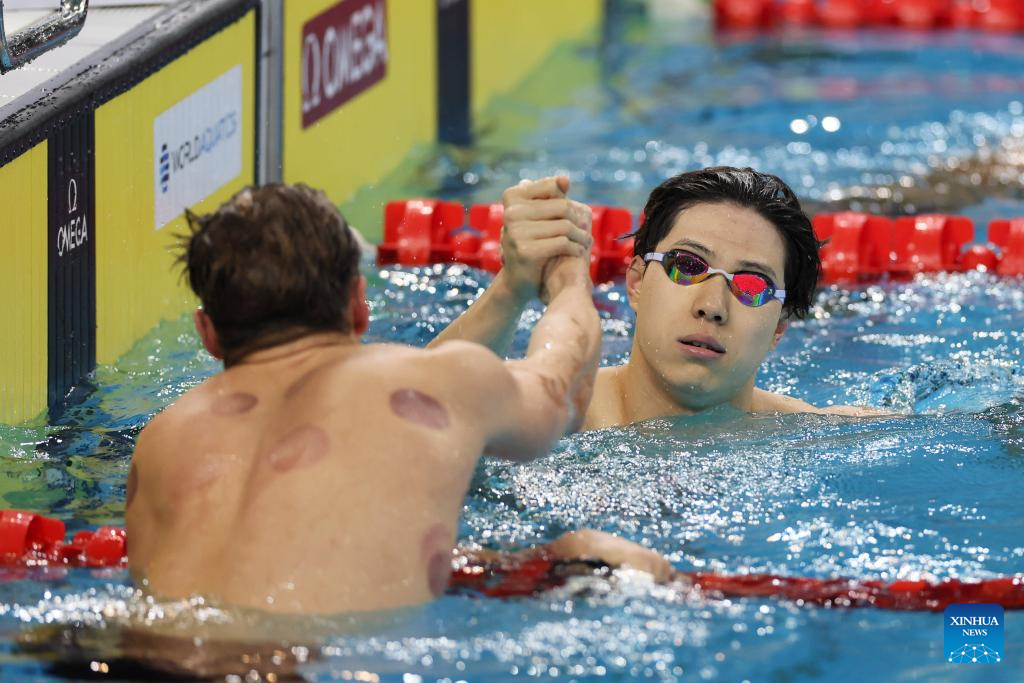 Qin Haiyang (L) of China reacts after the men's 50m breaststroke final at the World Aquatics Swimming World Cup 2024 in Shanghai, China, Oct. 19, 2024. (Xinhua/Wang Xiang)
