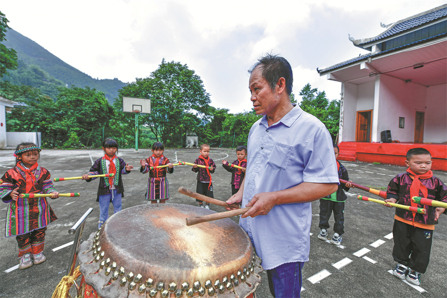 After a quiet summer break, the school campus springs to life as Meng Rongda rehearses the drum dance of the Yao ethnic group for the children.
