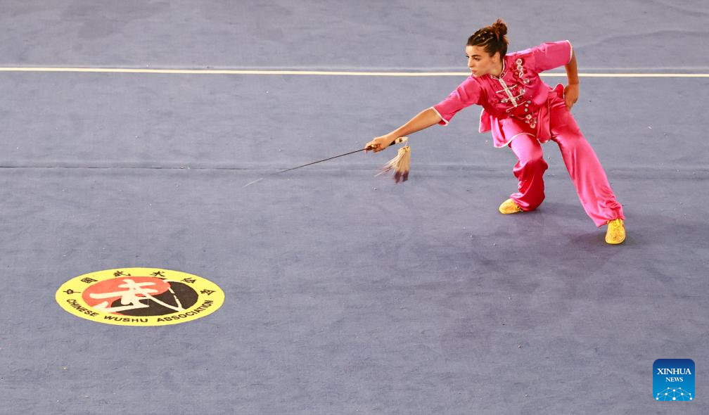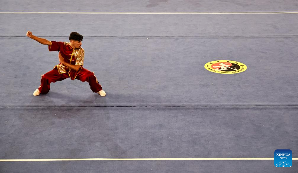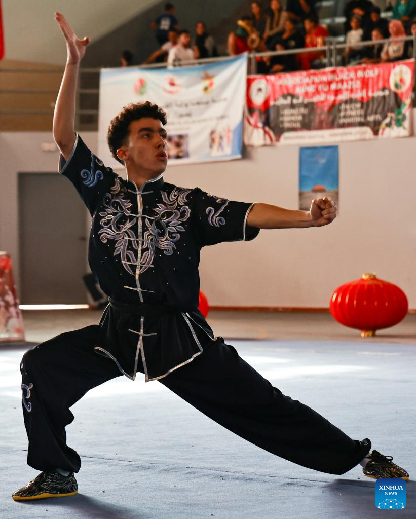 A Moroccan Wushu enthusiast competes in the 3rd "Ambassador Cup" Moroccan National Wushu Competition at Temara, Morocco, on Oct. 20, 2024. (Xinhua/Huo Jing)