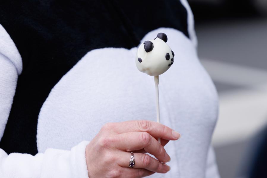 Giant-panda-shaped sweet is given out by a local bakery across the street from the Smithsonian's National Zoo and Conservation Biology Institute as the pandas arrive in Washington, D.C., the United States, Oct. 15, 2024. (Photo by Aaron Schwartz/Xinhua)
