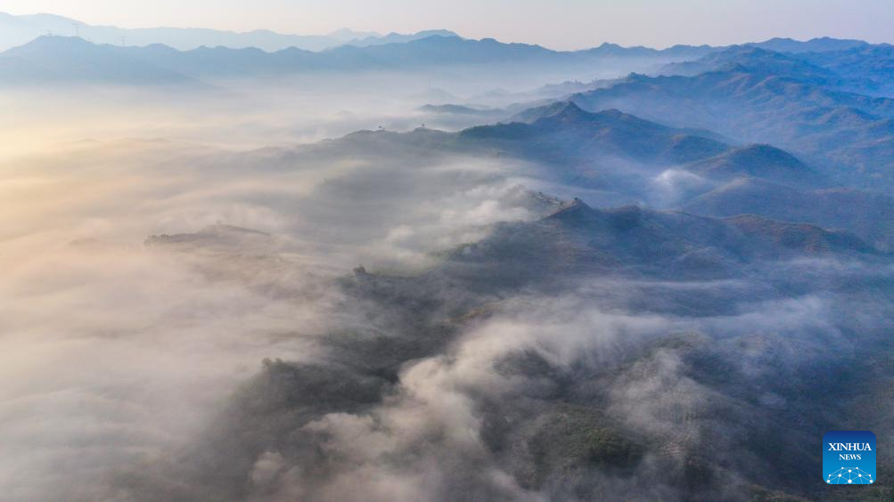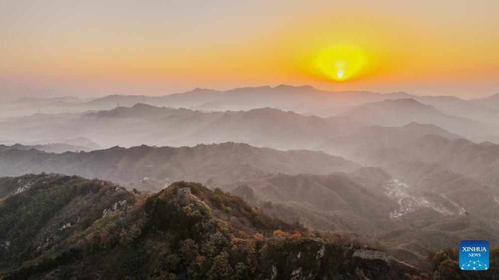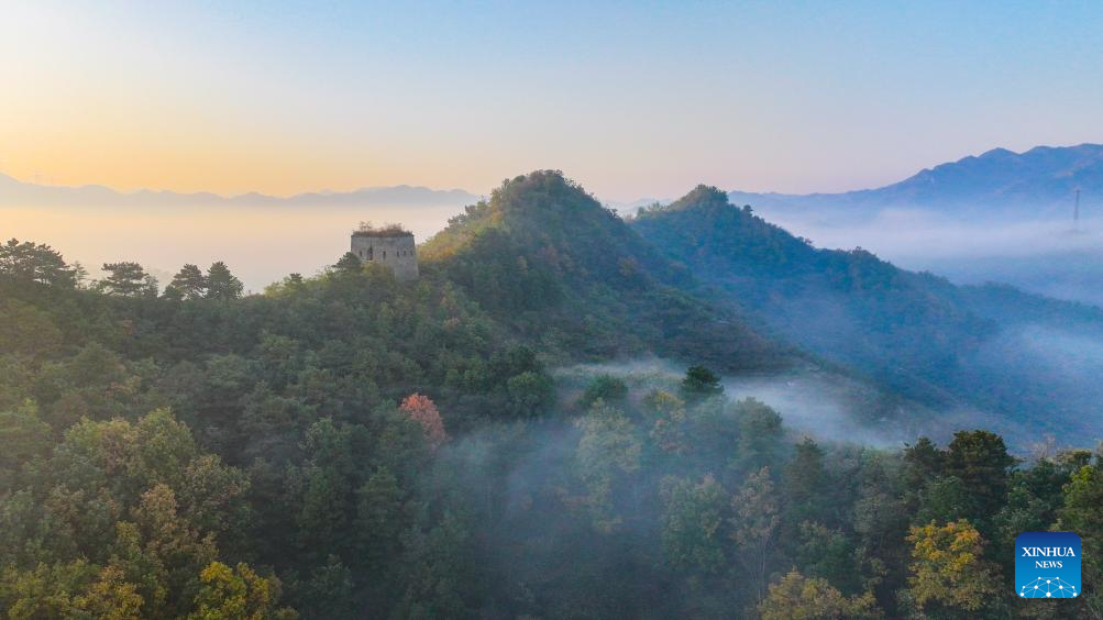 An aerial drone photo taken on Oct. 21, 2024 shows the morning scenery at the ancient Great Wall in Xiaochang Township, Zunhua City of north China's Hebei Province. (Photo by Liu Mancang/Xinhua)