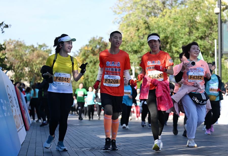 Participants run during the 2024 Tianjin Marathon, Oct. 20, 2024. (Xinhua/Sun Fanyue)