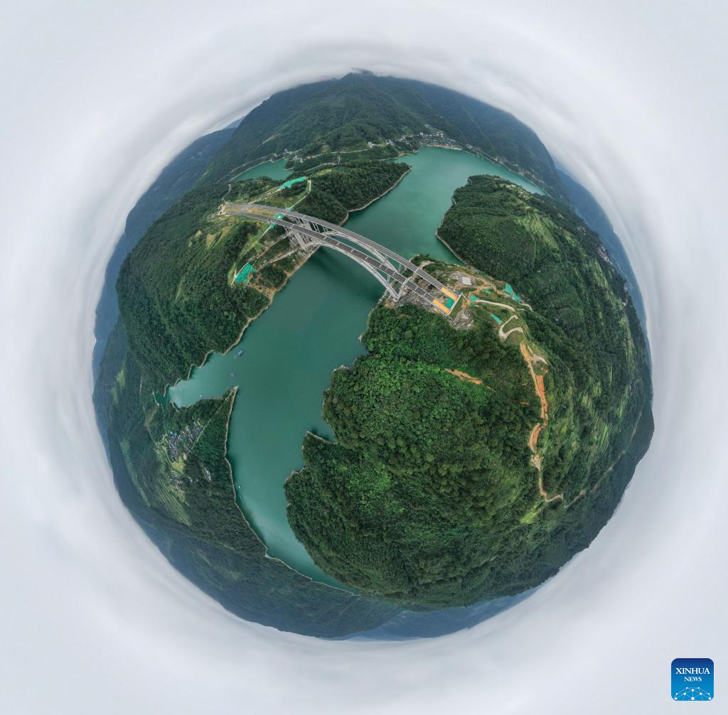 An aerial panoramic drone photo shows a section of an expressway linking Jianhe County and Liping County in southwest China's Guizhou Province, Oct. 20, 2024.