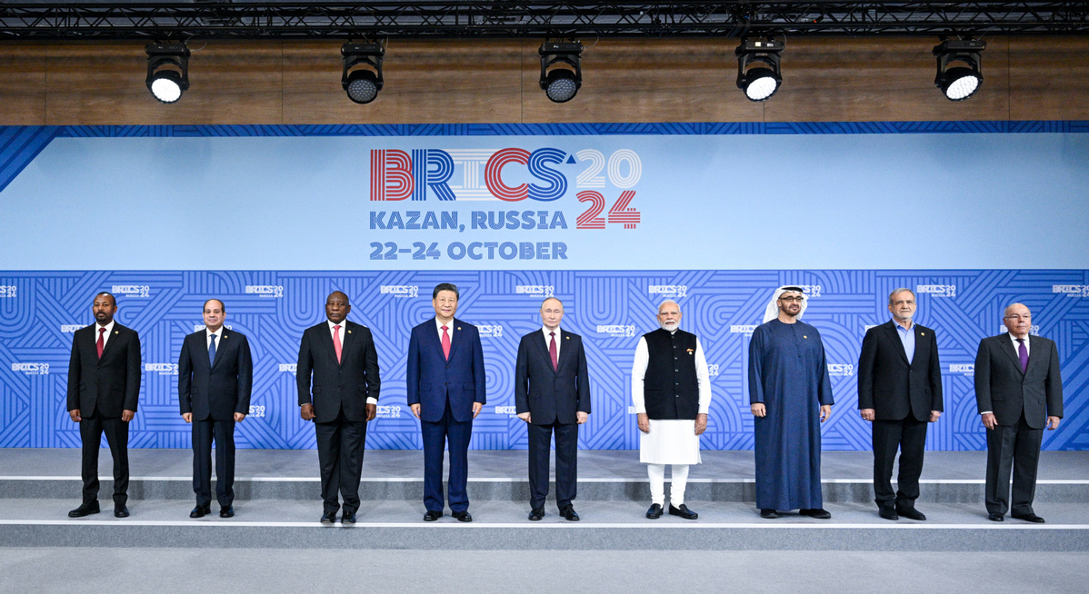 President Xi Jinping and other leaders of BRICS member countries pose for a group photo on Wednesday before a plenary session of the 16th BRICS Summit in Kazan, Russia. (LI XUEREN/XINHUA)