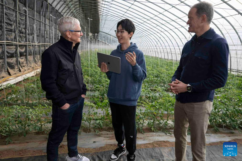 Shen Xinyi (C), a student at Zhejiang University, introduces a "science and technology backyard" to Apple CEO Tim Cook (L) and Jeff Williams, Apple's chief operating officer, at an organic farm in Shunyi District, Beijing, capital of China, Oct. 22, 2024. (Xinhua/Cai Yang)