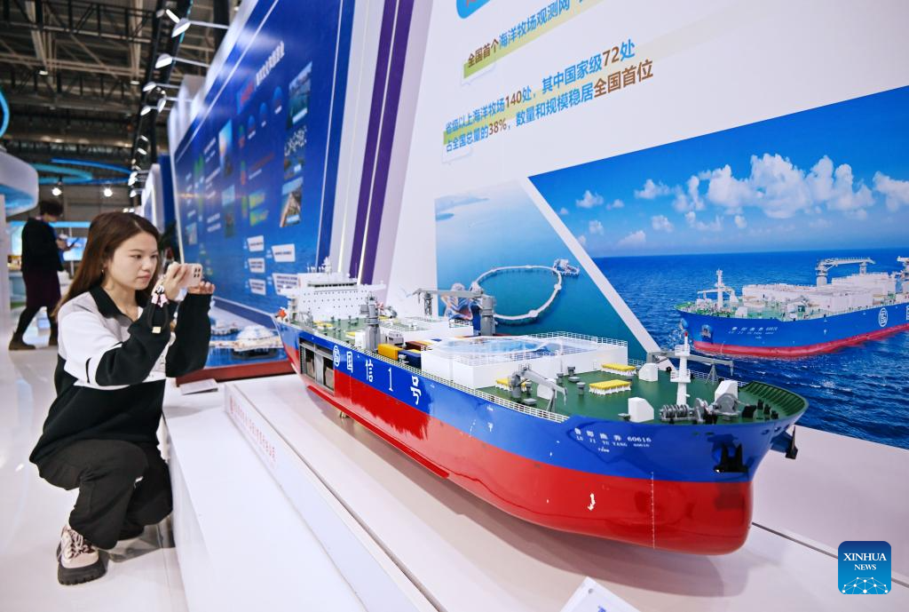 A visitor takes photos of the model of a ship for marine farming at the 2024 East Asia Marine Expo in Qingdao, east China's Shandong Province, Oct. 24, 2024. The 2024 East Asia Marine Expo opened Thursday in Qingdao, a coastal city of east China's Shandong Province, convening more than 500 exhibitors from home and abroad. (Xinhua/Li Ziheng)