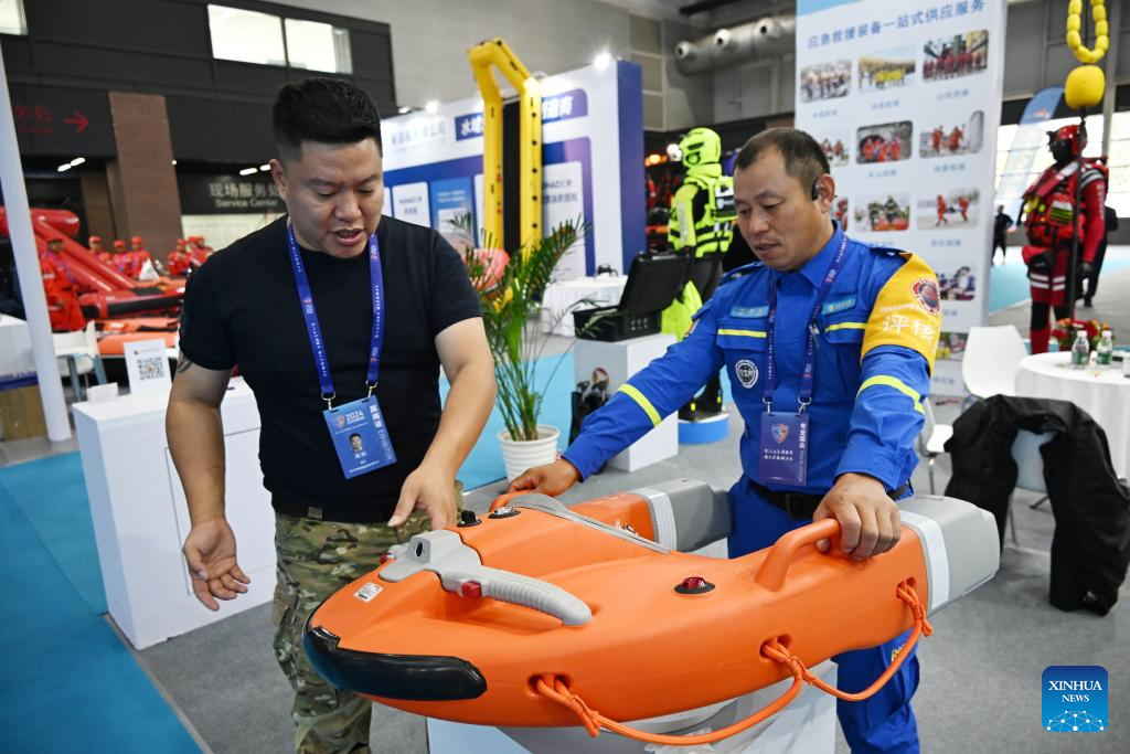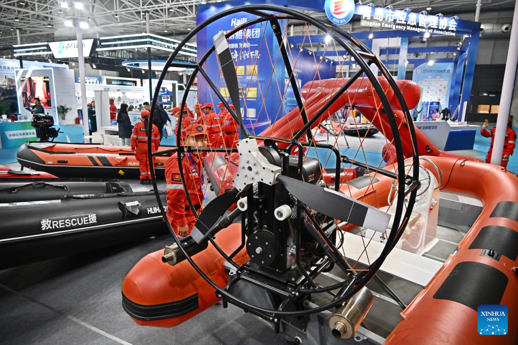 Equipment for marine emergency and rescue are displayed at the 2024 East Asia Marine Expo in Qingdao, east China's Shandong Province, Oct. 24, 2024. The 2024 East Asia Marine Expo opened Thursday in Qingdao, a coastal city of east China's Shandong Province, convening more than 500 exhibitors from home and abroad. (Xinhua/Li Ziheng)