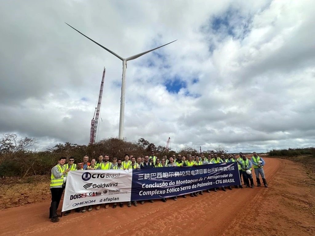 Chinese and Brazilian workers celebrate the completion of the successful hoisting of the first wind turbine at the construction site of the Serra da Palmeira Wind Complex in the state of Paraiba, Brazil, July 24, 2024. (Photo from the WeChat official account of the CTG Brasil)