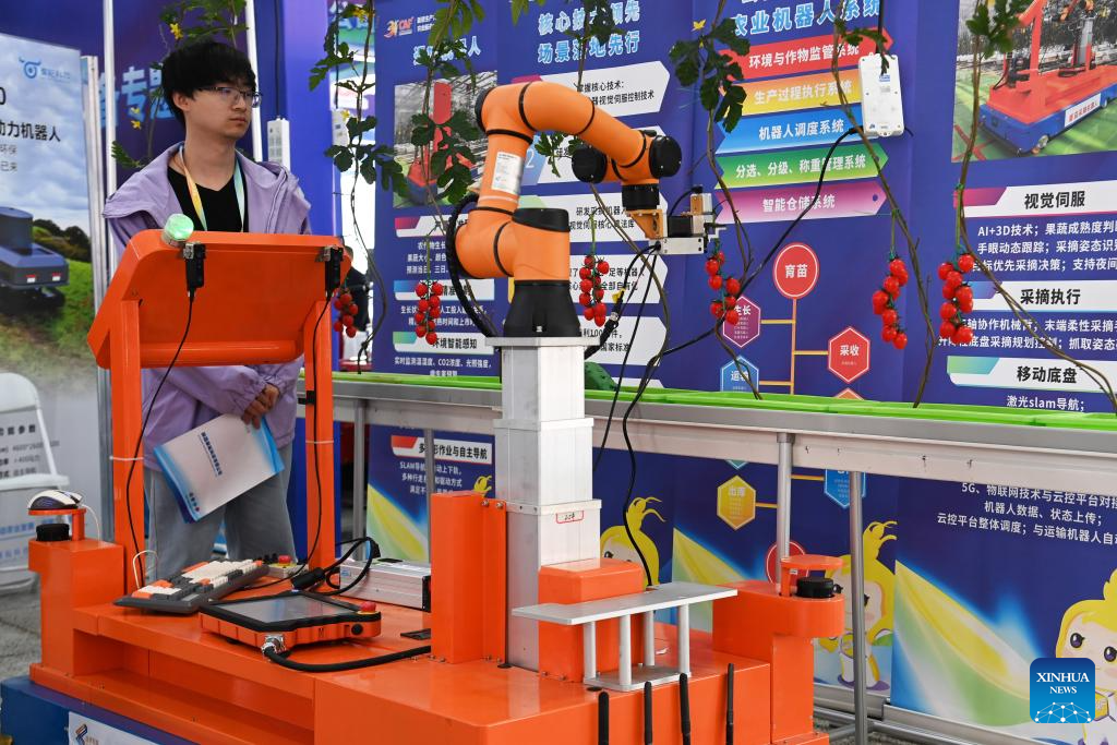 An automatic picking robot is displayed at the 31st China Yangling Agricultural Hi-tech Fair in Yangling, northwest China's Shaanxi Province, Oct. 25, 2024. Featuring innovations in agricultural high-tech achievements, the 31st China Yangling Agricultural Hi-tech Fair kicked off here on Friday. The fair will last until Oct. 29. (Xinhua/Zou Jingyi)