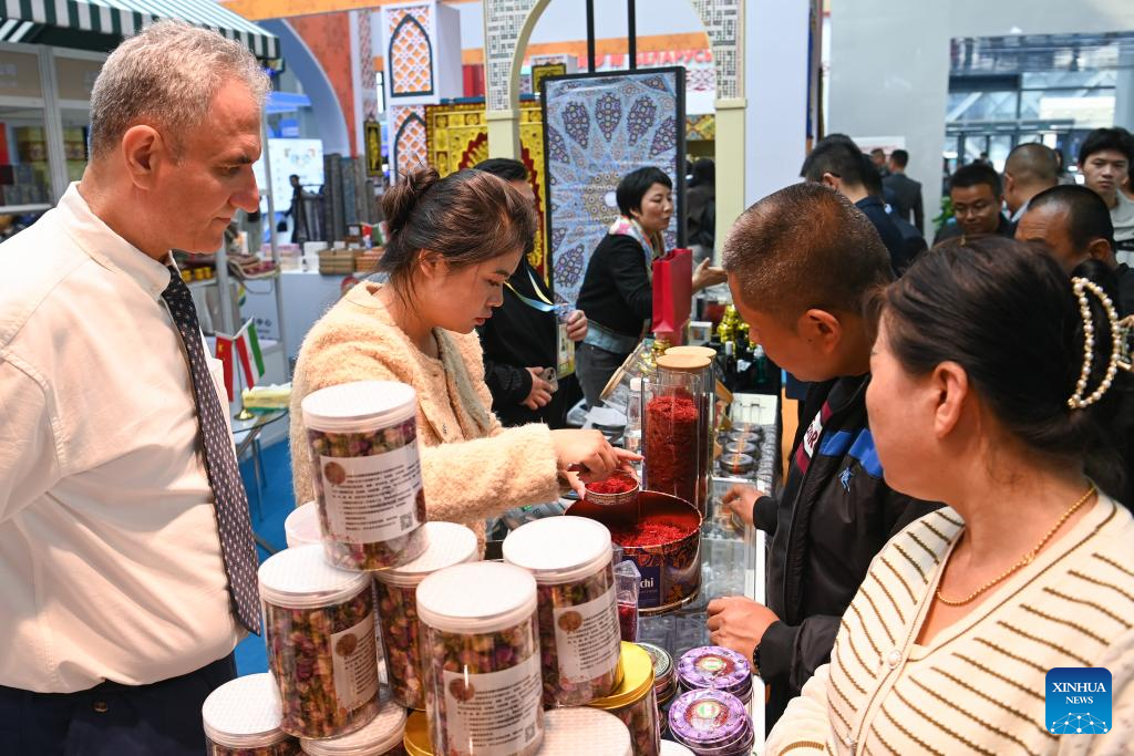 People visit an exhibition booth of Iranian saffron at the 31st China Yangling Agricultural Hi-tech Fair in Yangling, northwest China's Shaanxi Province, Oct. 25, 2024. Featuring innovations in agricultural high-tech achievements, the 31st China Yangling Agricultural Hi-tech Fair kicked off here on Friday. The fair will last until Oct. 29. (Xinhua/Zou Jingyi)