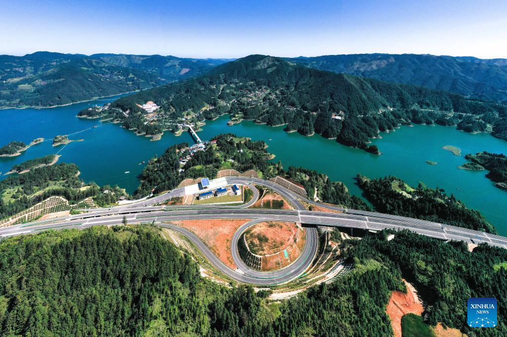 An aerial drone photo taken on Oct. 25, 2024 shows a section of the Jianhe-Liping expressway in southwest China's Guizhou Province. The Jianhe-Liping expressway was opened to traffic on Friday, shortening the travel time between Jianhe County and Liping County of Guizhou Province to about one hour. The main line of this expressway stretches 74.754 kilometers. (Xinhua/Yang Wenbin)