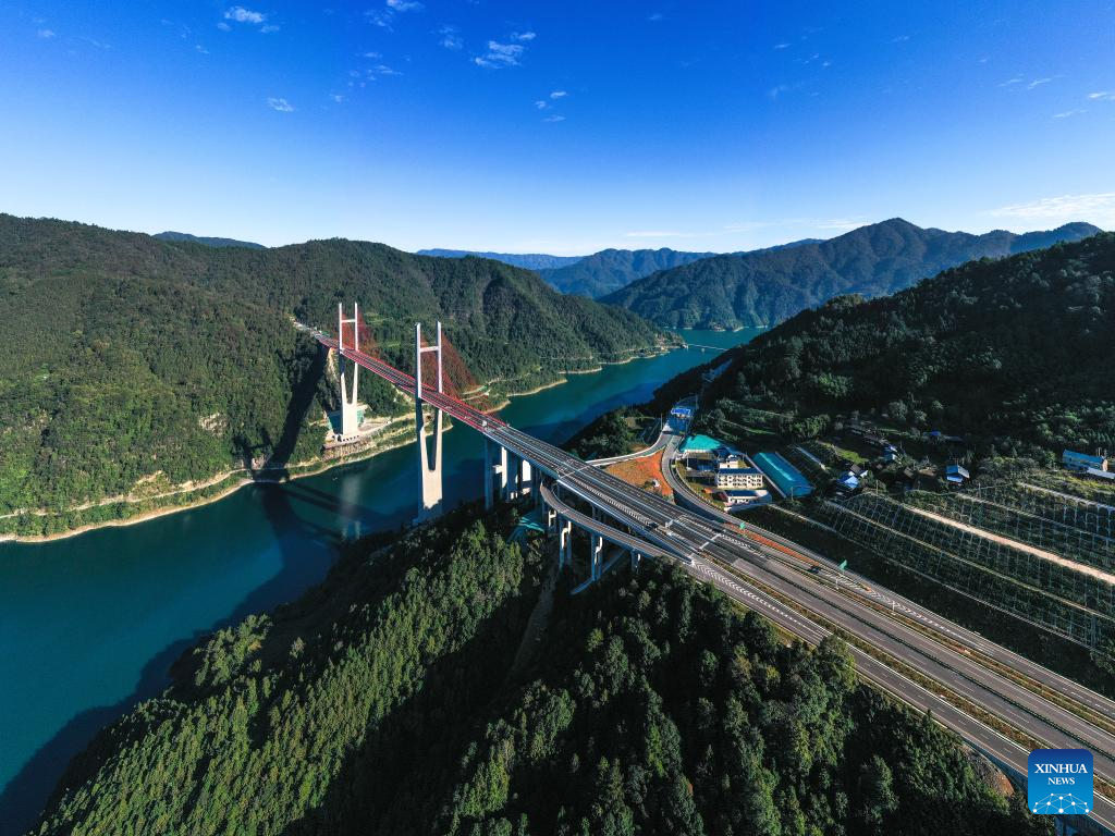 An aerial drone photo taken on Oct. 25, 2024 shows Nanmengxi bridge of the Jianhe-Liping expressway in southwest China's Guizhou Province. The Jianhe-Liping expressway was opened to traffic on Friday, shortening the travel time between Jianhe County and Liping County of Guizhou Province to about one hour. The main line of this expressway stretches 74.754 kilometers. (Xinhua/Yang Wenbin)