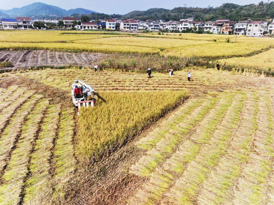 According to the Hunan provincial department of agriculture and rural affairs, grain production in the province remained sound this year. The harvesting of more than 22 million mu of middle-season rice in the province has been completed, with an estimated yield growth of about 1 percent year on year. Harvesting is nearing completion in more than 19 million mu of late rice fields, which can expect a yield increase of 1.5 percent year on year.