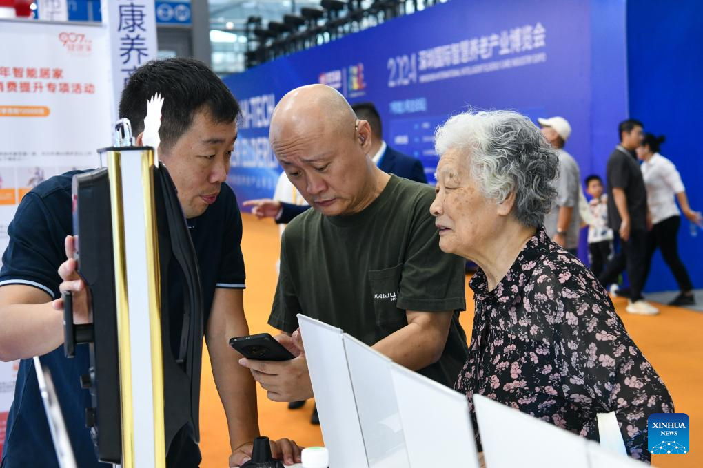 Senior citizens visit the 2024 Shenzhen International Intelligent Elderly Care Industry Expo in Shenzhen, south China's Guangdong Province, Oct. 27, 2024. A total of 203 exhibitors from home and abroad have brought more than 1,000 products and technologies for elderly care to the expo, which was held from Oct. 25 to 27 in Shenzhen. (Xinhua/Liang Xu)