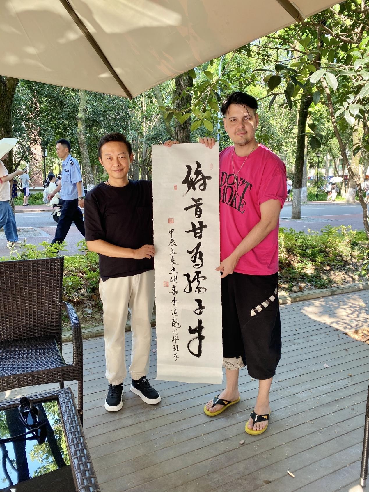Lacerda Dantas Wagner and his mentor Zheng Zhongming pose for a picture with a piece of Chinese calligraphy. (Photo provided by Lacerda Dantas Wagner)