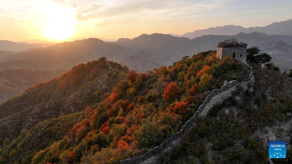An aerial drone photo taken on Oct. 27, 2024 shows the autumn scenery around a section of the Great Wall at Wangzhai Township in Zunhua City, north China's Hebei Province. (Photo by Liu Mancang/Xinhua)