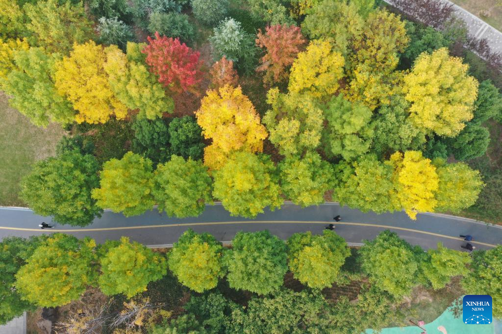 An aerial drone photo taken on Oct. 28, 2024 shows the autumn scenery of a park at Wenxian County in Jiaozuo City, central China's Henan Province. (Photo by Xu Hongxing/Xinhua)