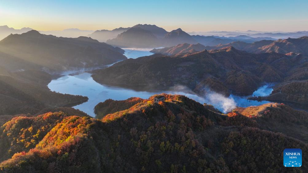 An aerial drone photo taken on Oct. 28, 2024 shows the autumn scenery around a section of the Great Wall at Panjiakou reservoir in Qianxi County, north China's Hebei Province. (Photo by Liu Mancang/Xinhua)