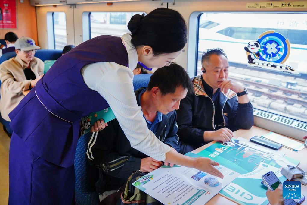 A train attendant introduces to passengers the seventh China International Import Expo (CIIE) during a promotion event for the CIIE on the train D3205 on Oct. 28, 2024. The CIIE is scheduled to take place in Shanghai from Nov. 5 to 10. (Photo by Xie Xin/Xinhua)