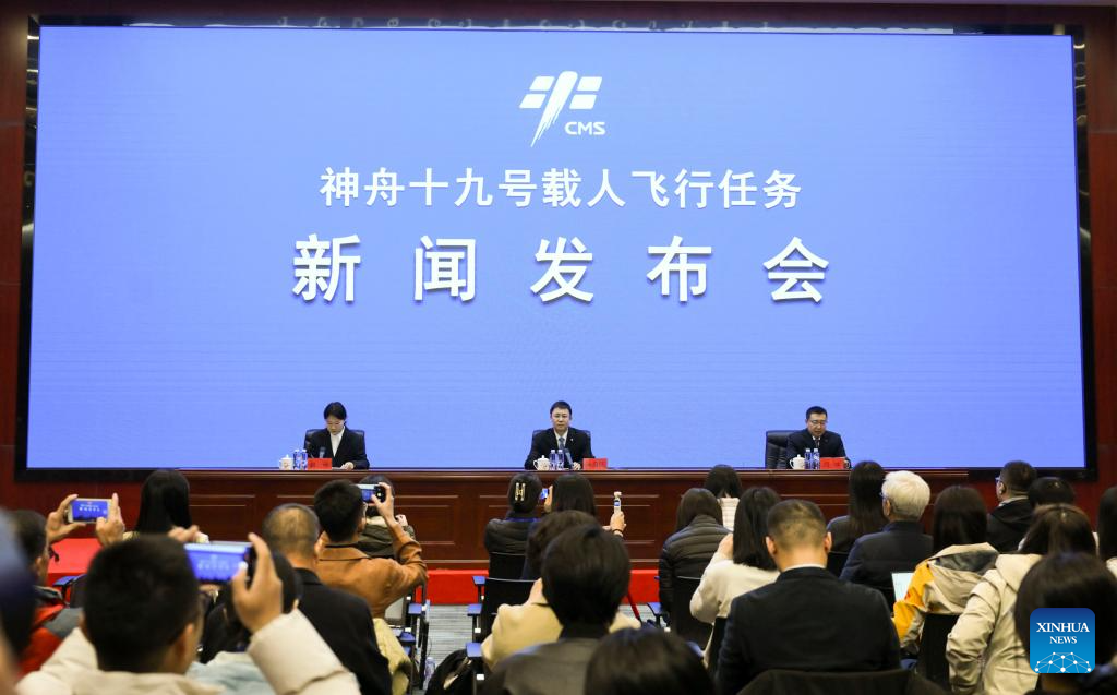 A press conference on the Shenzhou-19 crewed spaceflight mission is held in Jiuquan Satellite Launch Center in northwest China on Oct. 29, 2024. Chinese astronauts Cai Xuzhe, Song Lingdong and Wang Haoze will carry out the Shenzhou-19 crewed spaceflight mission, and Cai will be the commander, the China Manned Space Agency announced at a press conference on Tuesday. The Shenzhou-19 crewed spaceship is scheduled to be launched at 4:27 a.m. Wednesday (Beijing Time) from the Jiuquan Satellite Launch Center in northwest China, said Lin Xiqiang, spokesperson of the agency. (Xinhua/Li Zhipeng)