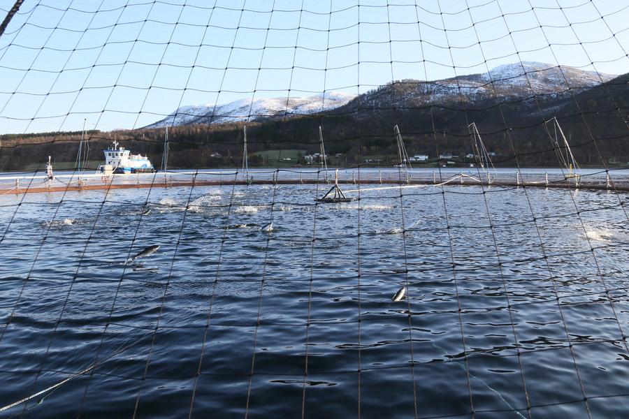 This photo taken on Oct. 10, 2023 shows a salmon farm in the fjord of Troms County in northern Norway. (Xinhua/Zhang Yuliang)