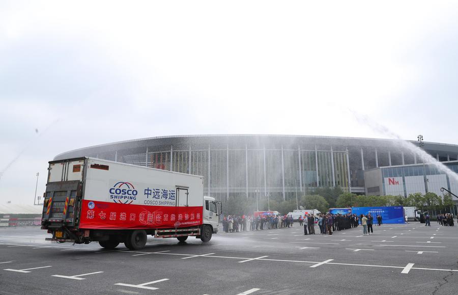 A truck loaded with exhibits for the upcoming 7th China International Import Expo (CIIE) is greeted with a water salute during an accession ceremony for exhibits at the National Exhibition and Convention Center (Shanghai), the main venue for the CIIE, in east China's Shanghai, Oct. 22, 2024. (Xinhua/Fang Zhe)