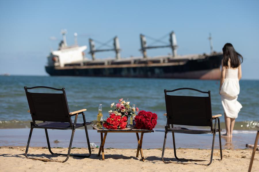 A tourist enjoys leisure time at the beach in Rongcheng City of east China's Shandong Province, Oct. 3, 2024. (Photo by Yi Fan/Xinhua)